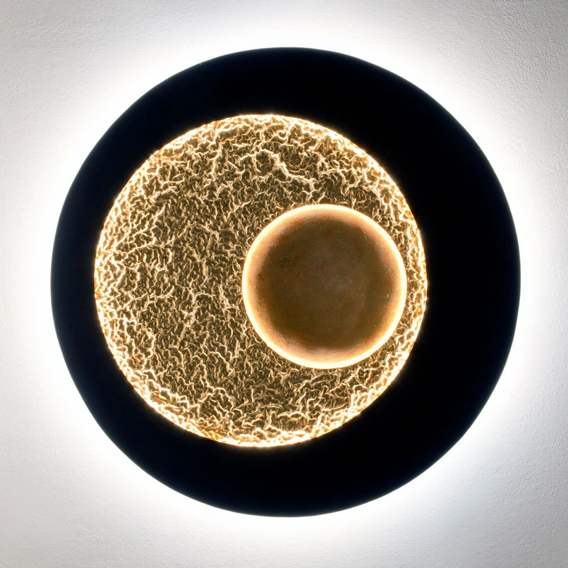 Atmosfærisk LED-vegglampe Urano LED-vegglampen Urano, som er laget helt i jern, skaper en fantastisk lyseffekt. Den består av en stor, rund sirkel i svartbrunt, hvorpå ytterligere to sirkler er plassert som måner. De to indre sirklene er gullfargede, og den største av dem er hamret, noe som ytterligere forsterker det dekorative uttrykket og "måneeffekten". Den indre og den ytre sirkelen er utstyrt med hver sin LED-stripe, som ikke bare skaper en lyskrone på veggen, men også fremhever den hamrede overflaten på midtsirkelen med lyset fra den lille "månen" - kan dimmes eksternt