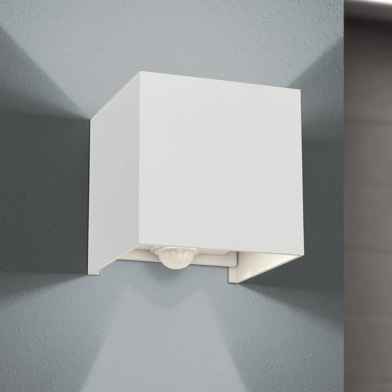 Utendørs vegglampe Cube-S, hvit, metall, bevegelsessensor