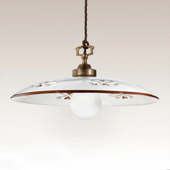 Rustikk BASSANO pendellampe med dekorert keramikkskjermPendellampen BASSANO har en tradisjonell, rustikk stil. Den formskjønne messingholderen kompletteres av en buet keramikkskjerm. Dekorative ornamenter i kontrastfarger gir skjermen sin sjarm. BASSANO-pendellampen gir stemningsfull belysning og utstråler et dekorativt utseende. De eksklusive belysningsproduktene fra denne produsenten er utelukkende håndlaget i Italia, der det legges stor vekt på å velge materialer av høy kvalitet. Dette skyldes ikke minst ønsket om å videreføre den lange tradisjonen med venetiansk belysningskunst og produsere produkter som er skapt med lidenskap og omhu og har små særtrekk som gjør dem unike og umiskjennelige.