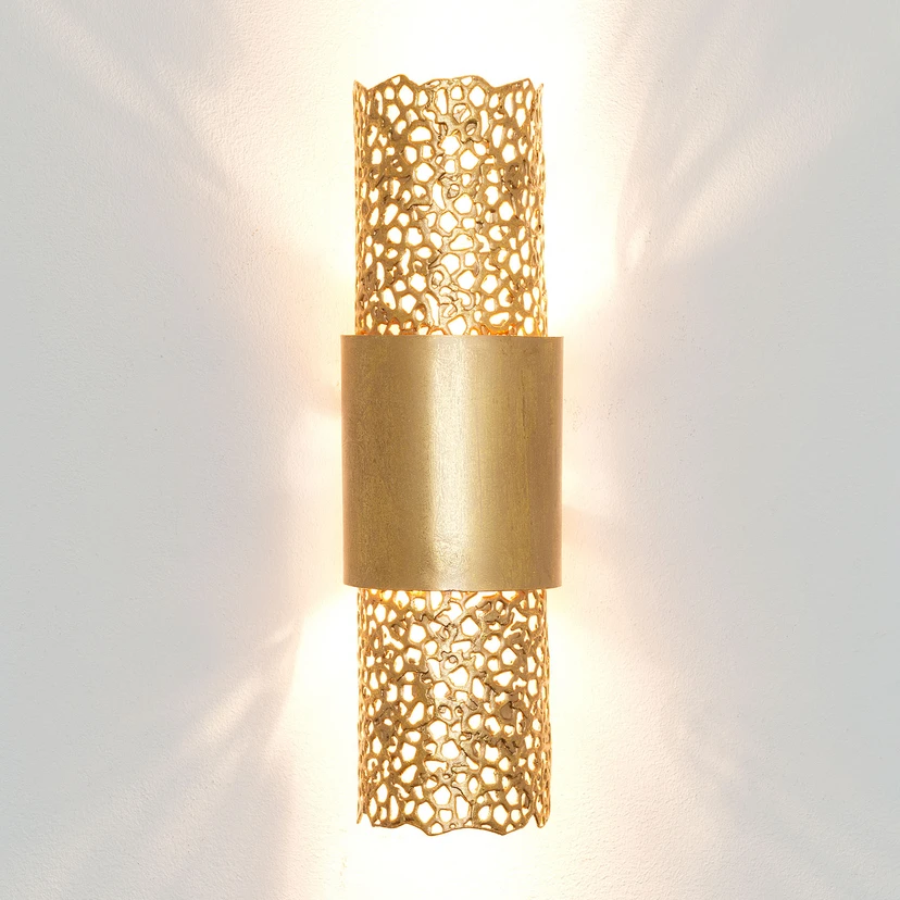 Den lange vegglampen fordeler lyset vertikalt over en gullstruktur med filigrant mønster. Den kunstneriske dekorasjonen minner om smeltet metall, som i likhet med små bekker ofte forgrenes og komme sammen på nytt. I midten omfavner en bred gullkant hele komposisjonen. Med denne kan lampen monteres på veggen. Den kan også monteres horisontalt.