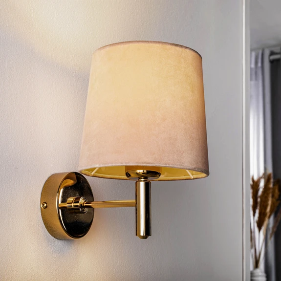 Vegglampe Polo i beige og mørk messing kombinerer stilig estetikk med funksjonell fleksibilitet. Lampen er laget av høykvalitets velourstoff og robust stål, og passer perfekt inn i forskjellige oppholdsrom som stue, soverom og spisestue. Den elegante fargekombinasjonen av beige og mørk messing gir ethvert rom en varm og innbydende atmosfære.