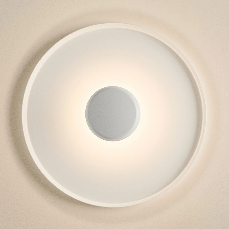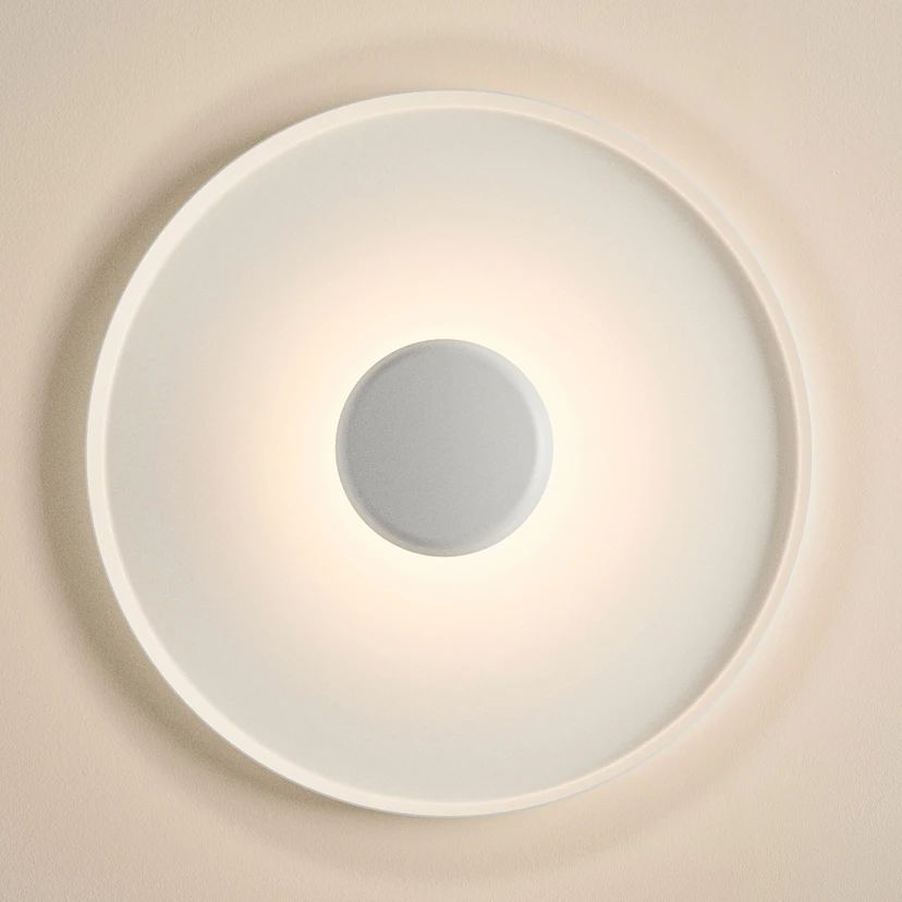 Vibia designet av designerne Ramos & Bassols for Vibia er preget av en behersket eleganse og høy kvalitet på håndverket. De to konsentriske sirkler med en naturlig finish rammer inn den LED-drevne lyskilden og fordeler det varme lyset jevnt i området.