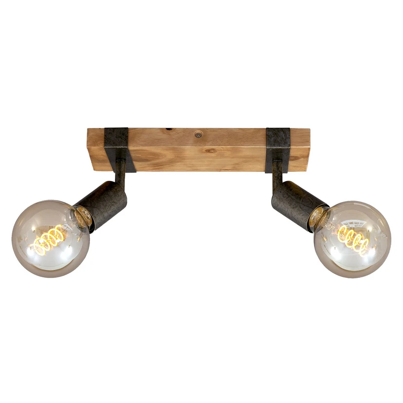 Wood Basic taklampe med 2 lyskilder med treelement og metallfatninger Denne taklampen med 2 lyskilder er produsert i en trendy kombinasjon av naturlig tre og metall. Den rektangulære treholderen er utstyrt med to metallbraketter som holder E27-fatningene på små utkragede armer. Fatningene kan svinges og vippes. Armaturen ser spesielt dekorativ ut når den er utstyrt med fargede globepærer. Avhengig av hvilken pære som brukes, kan armaturens utseende og belysning varieres. Pærer er ikke inkludert i leveransen.